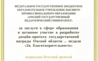 30 апреля 2014 года в Законодательном Собрании Омской области губернатор В.И. Назаров вручил ректору ОмГПУ О.В. Волоху Почетную грамоту Правительства Омской области за заслуги в сфере образования и активное участие в разработке дизайн-проекта государственной награды Омской области – медали «За благотворительность».